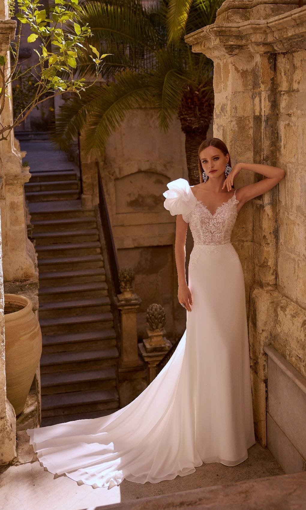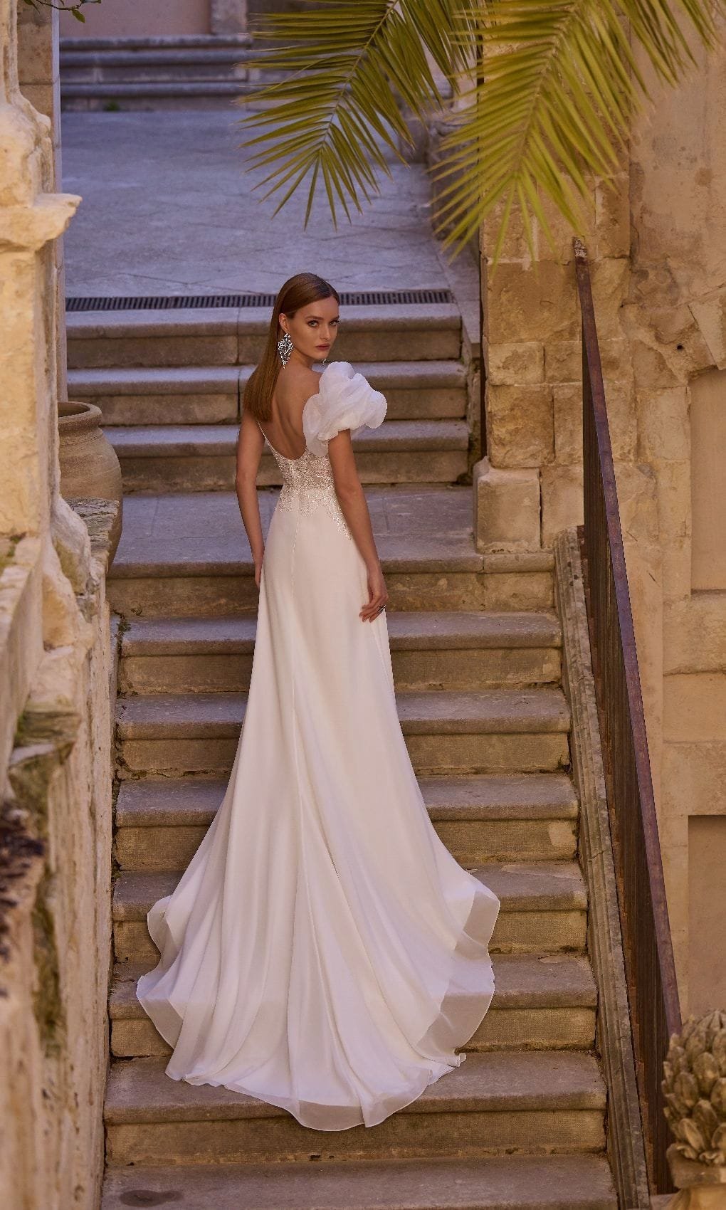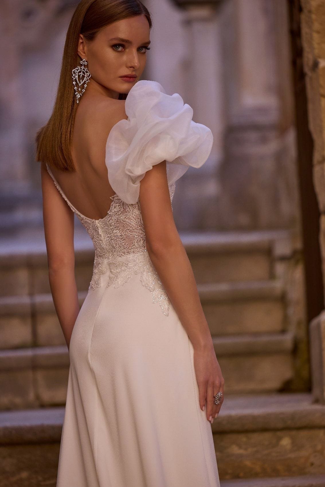 Scopri il fascino di Isabel abito da sposa asimmetrico aderente e svasato, progettato per esaltare la tua bellezza nel giorno più importante. Questo abito è una celebrazione di eleganza e unicità.