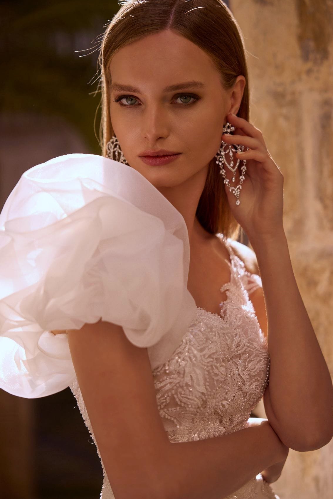 Il corpetto in pizzo con perline aggiunge un tocco di raffinatezza, mentre il motivo a balze su una spalla staccabile crea un movimento affascinante. Ogni dettaglio è pensato per renderti la protagonista assoluta.