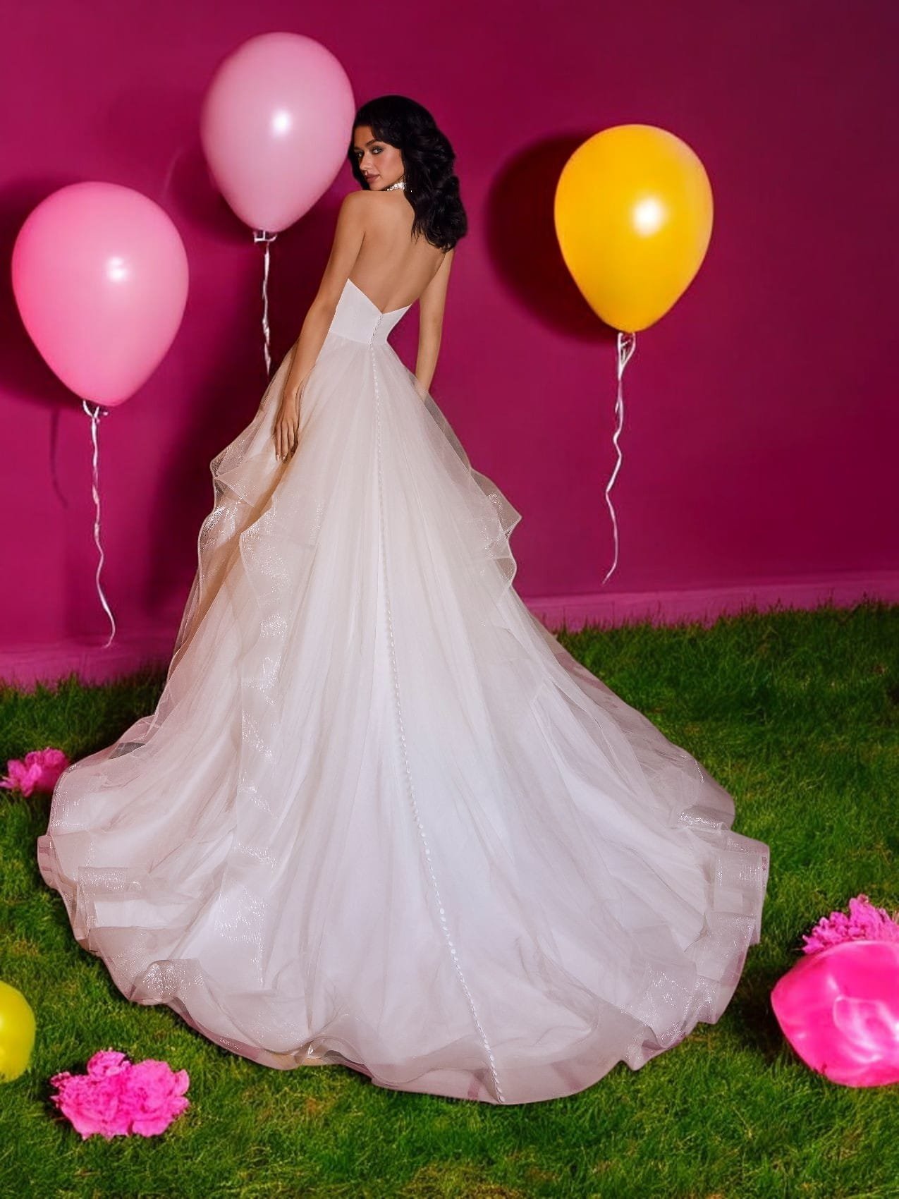 Il fascino dell’abito da sposa si estende ben oltre il corpetto grazie a una gonna in tulle straordinariamente progettata. Questo elemento fondamentale del design si distingue per i suoi strati a balze, che non solo aggiungono consistenza, ma anche movimento e dimensione, trasformando un tradizionale abito da sposa in un’opera d’arte moderna e dinamica. Ogni balza contribuisce a creare un effetto visivo affascinante che cattura l’attenzione e conferisce un senso di leggerezza e fluidità all’intero abito.