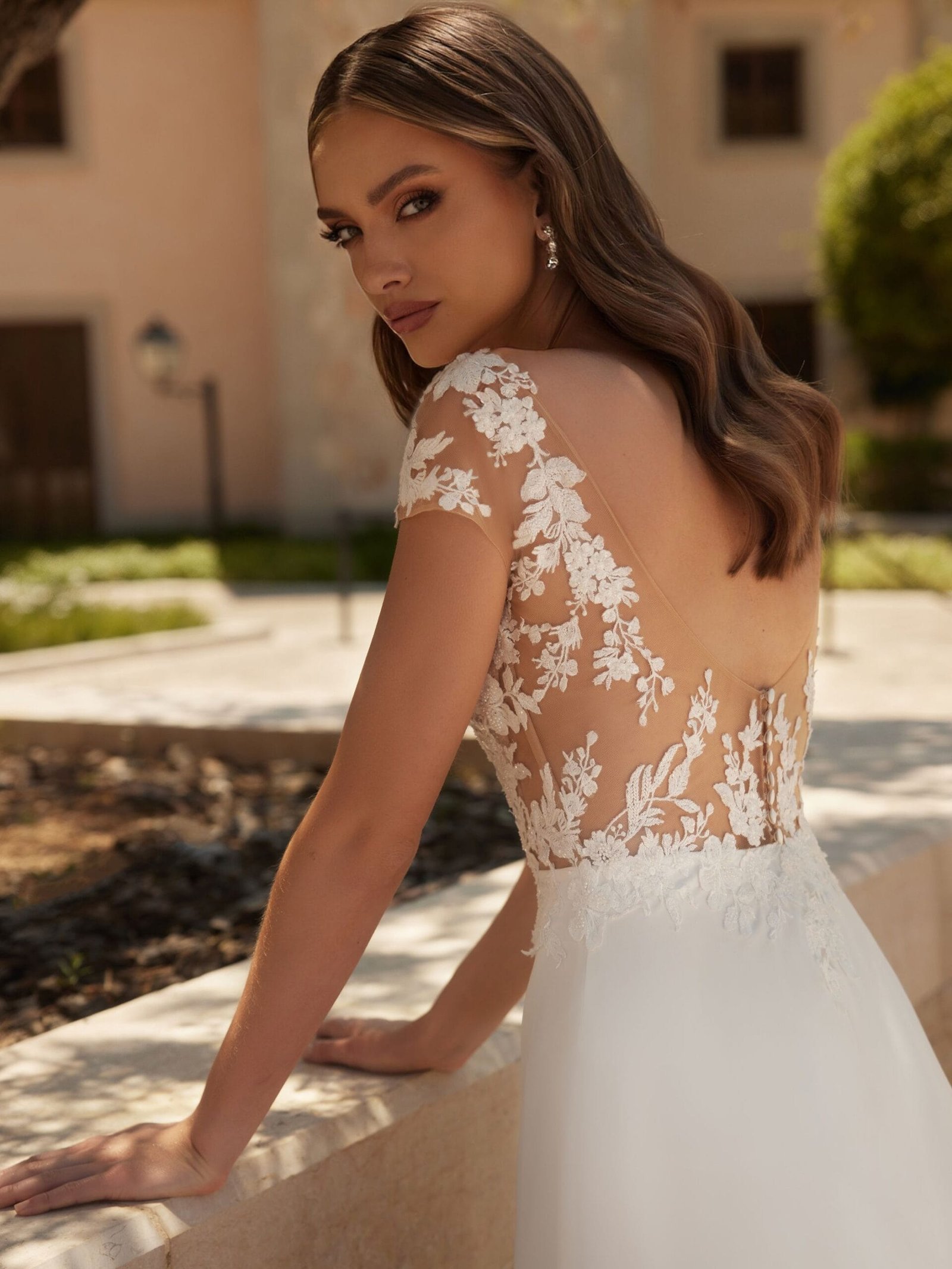 Le maniche a coppa sono state progettate per offrire una copertura discreta ma elegante, rendendo l’abito versatile e adatto a cerimonie sia formali che informali. Questa scelta di design non solo aggiunge un tocco di classe, ma garantisce anche il comfort della sposa durante l’intera giornata. La scollatura a V, presente sia sul davanti che sul retro dell’abito, esalta la figura della sposa, aggiungendo un tocco di sensualità senza compromettere la raffinatezza complessiva del look.