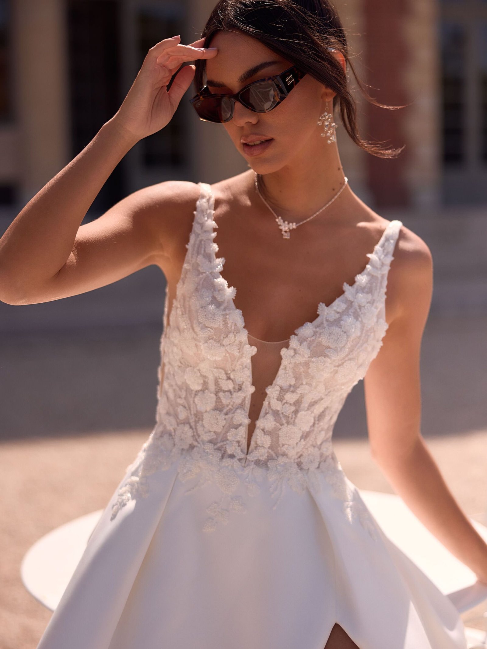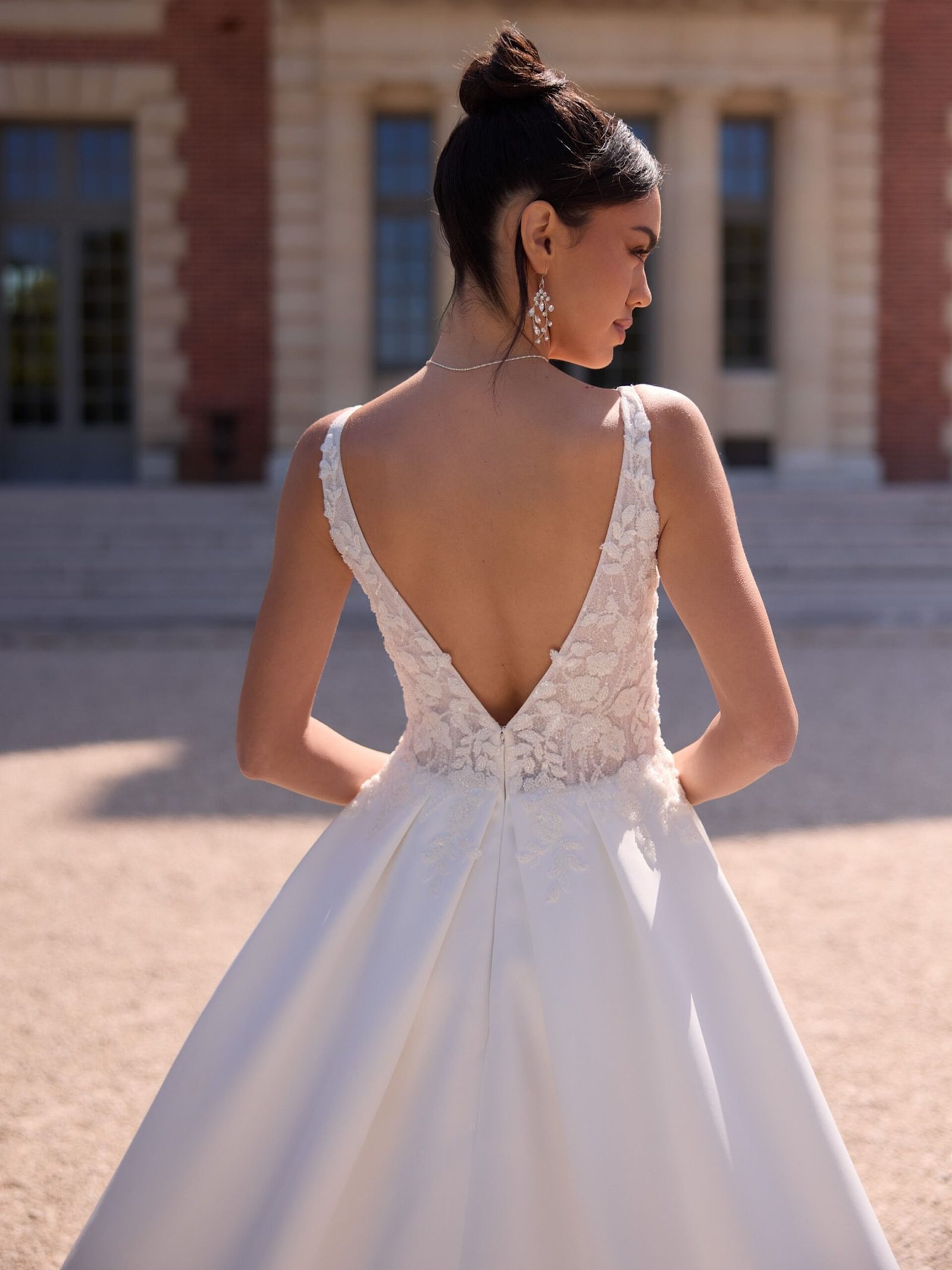 Uno degli elementi più distintivi di Vittoria sono i ricami con fiori in cristallo sul corpetto. Questi dettagli scintillanti catturano la luce, donando luminosità e raffinatezza al look. Inoltre, il design senza maniche, insieme alla profonda scollatura a V sul retro e alla V sul davanti, aggiunge un tocco contemporaneo che esalta la femminilità della sposa. Il lungo strascico completa il vestito con un’innegabile eleganza regale, perfetto per creare un impatto memorabile.