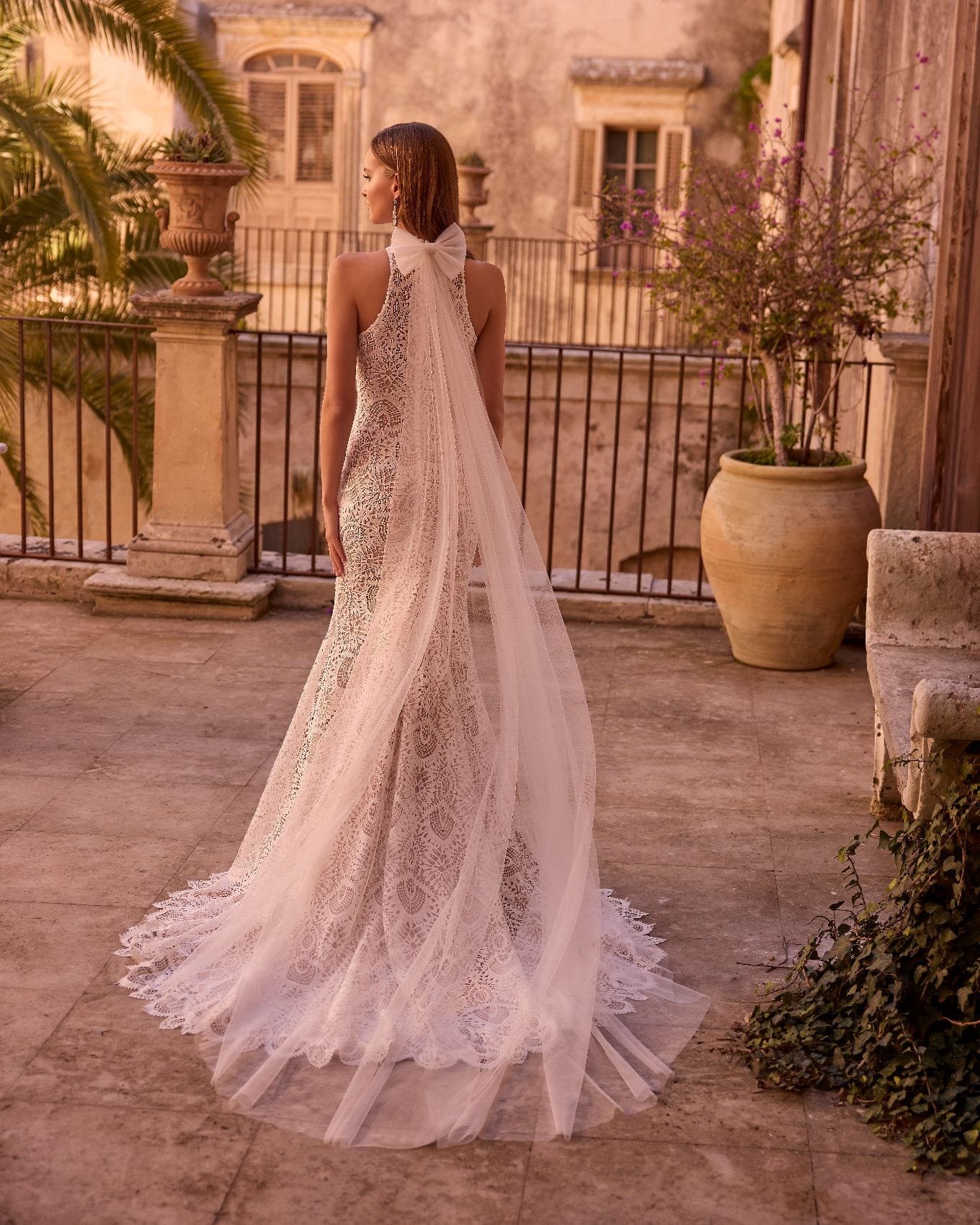 Questo splendido abito da sposa dallo stile moderno presenta una scollatura halter che mette in risalto le spalle e il collo, aggiungendo un tocco di sensualità senza essere troppo audace. Il design aderente sottolinea le curve naturali del corpo, offrendo una silhouette slanciata e raffinata. È un abito perfetto per chi desidera sentirsi sicura e glamour nel giorno più importante della propria vita.